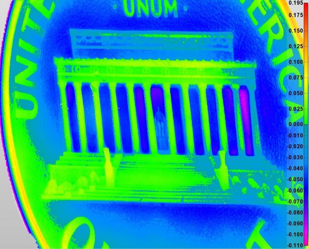 让我们回到美国便士的林肯先生。为了测量硬币的背面,我们使用了SURFACEINSPECT 3D 计量系统,其镜头 FOV 为 54 x 54 mm,工作距离(间距)为 125 mm,光斑尺寸为 6 µm (FHM)。