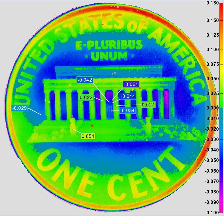为说明此功能,我们使用 Novacam SURFACEINSPECT TM 3D 计量系统扫描一美分硬币的细节。表面测量系统该系统基于低相干干涉测量法,测量精度为微米级,但其典型测量周期仅为几秒,通常可满足具有挑战性的车间应用。