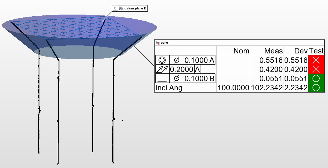 埋头孔与表面平面的垂直度。(在这个例子中,一个 besfit 平面被用来代表表面平面。bestfit 是基于在每个轮廓上测量的第一个点。)