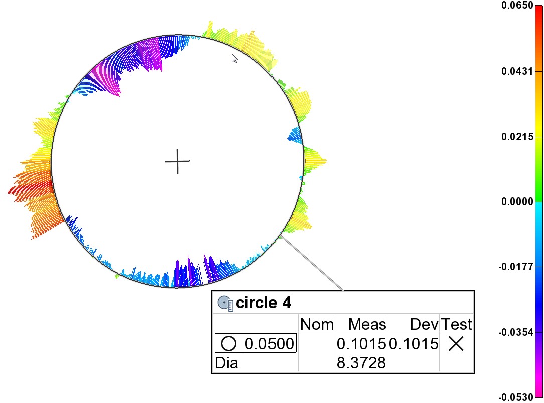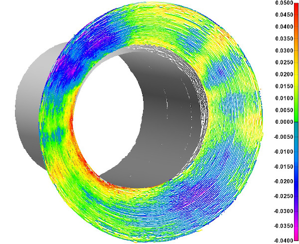 在埋头孔的圆形轮廓和高密度螺旋扫描中,颤动都很明显。NOVACAM 颤振分析软件可用于根据采集的 3D 数据自动分析和量化颤振缺陷。